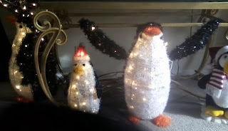 At PT Noelle tested me, and there has been improvement in several areas. Maybe not as much as we'd like to see, but at least I'm going in the right direction. On the way home I (finally) stopped in at Kohl's to spend my $20 Kohl Cash (good only Dec 26-Jan 4.) I found a black shirt, priced at $20, that should work perfectly for Alex's Ugly Sweater project. When I checked out it turned out to be on sale and was only $11.99, so I went back to find something else to spend the remaining $8.01 before the coupon expires Saturday: a penguin candle holder and candle ($3.99 each) for the hot tub, which left 3 cents.